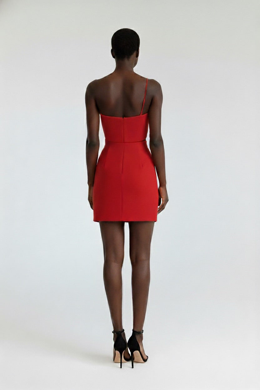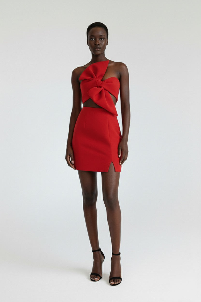 Striking & Structured: The Zen Red Mini Dress combines the allure of a two-piece set with seamless design. This integrated cropped dress features a dramatic, oversized bow on the asymmetrical one-shoulder bodice, perfectly balanced by a high-waisted, fitted mini skirt with a subtle side slit. A true statement piece for cocktail parties and special events.