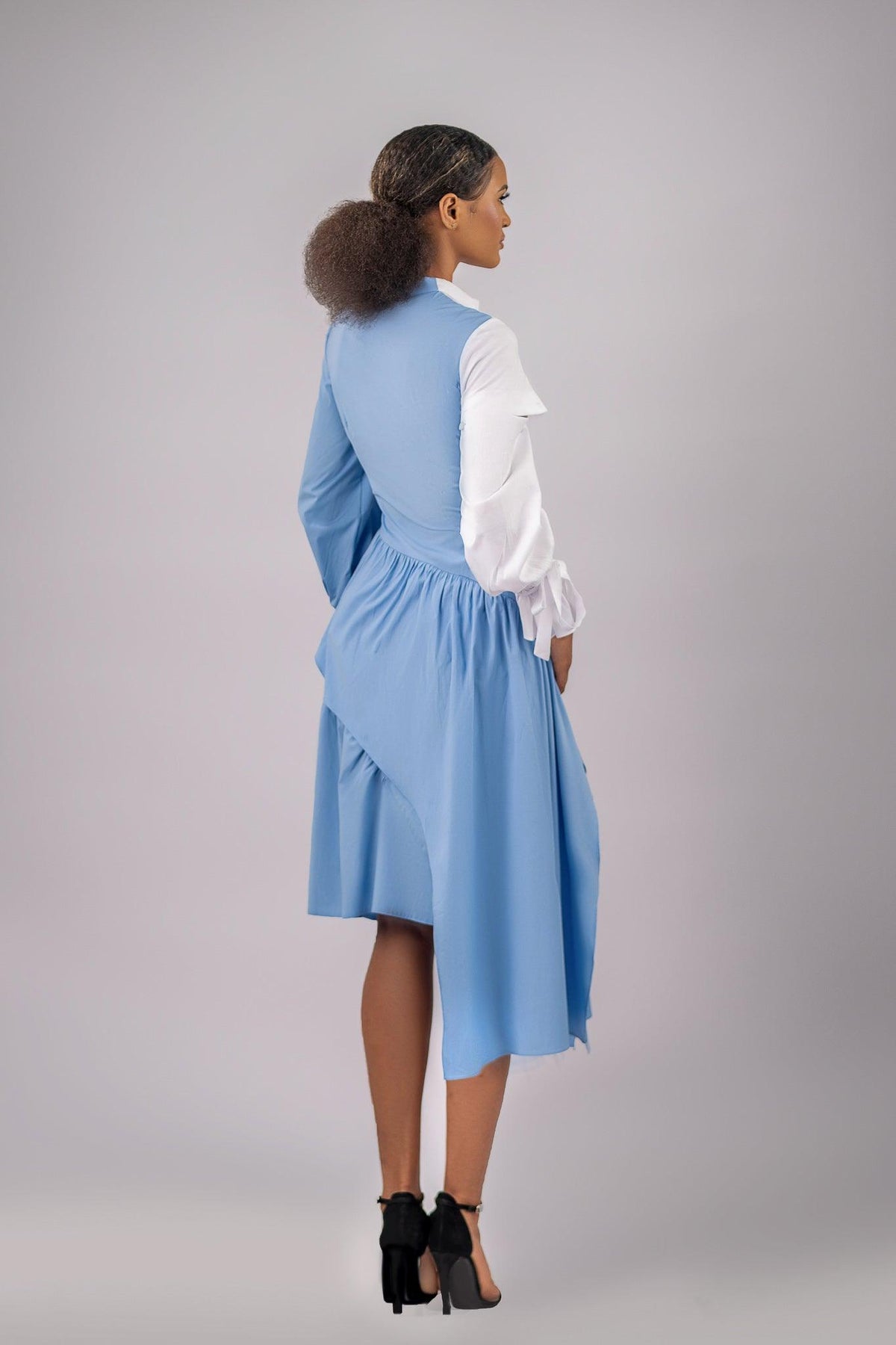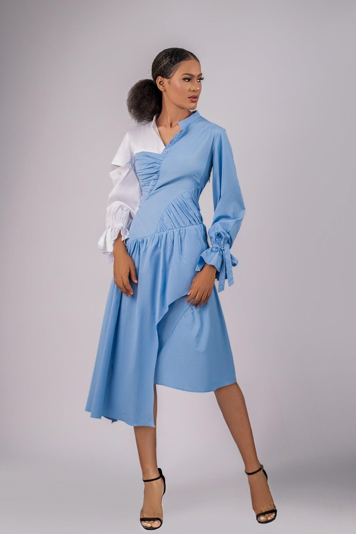 ‘Brianna’ is made from a mix and match of blue and plain white cotton that's perfect for every skin tone. The hemline is asymmetric and the silhouette has special seams that curve over the hips to exaggerate your curves.