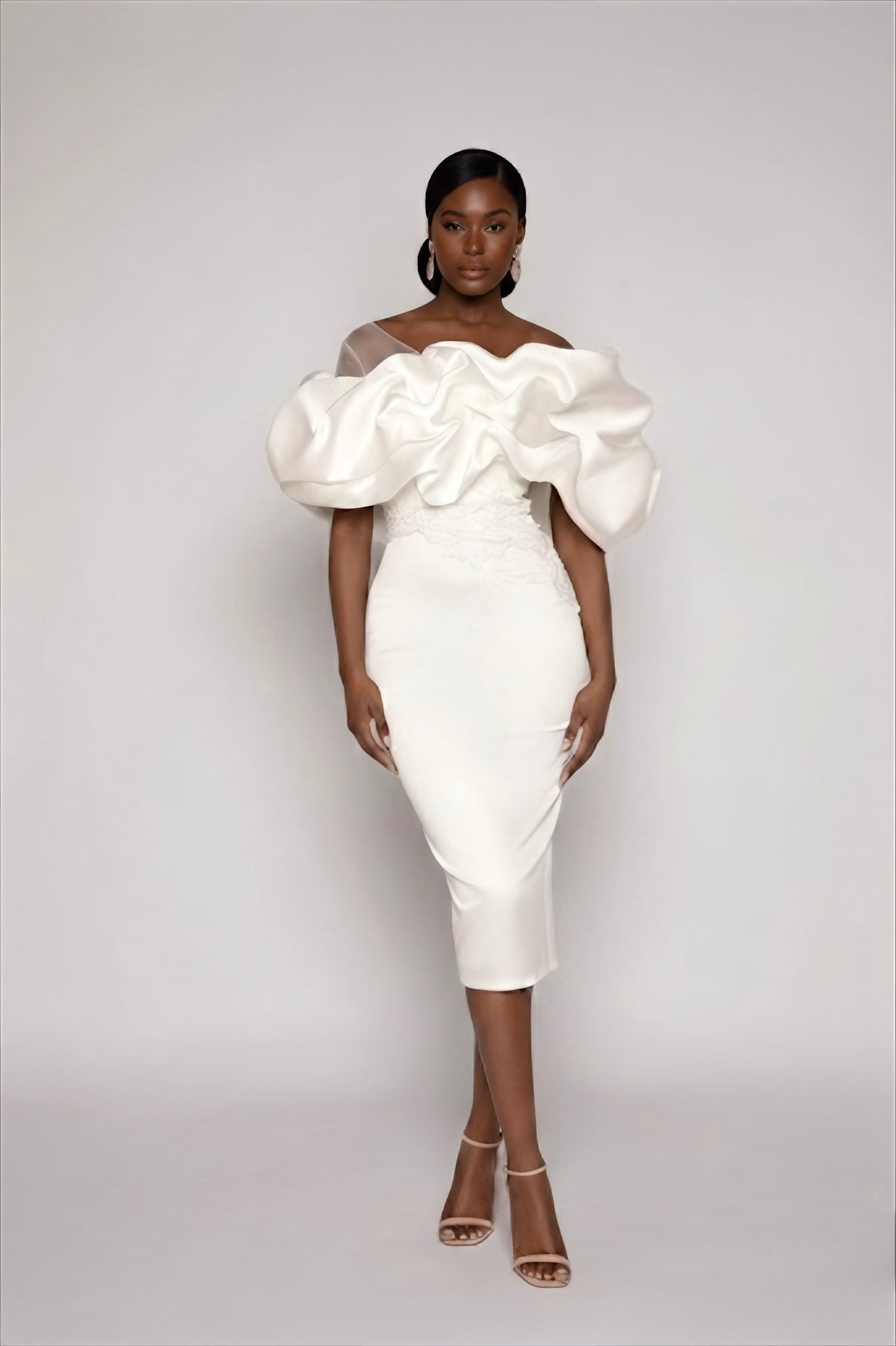 Puff Off Shoulder White Civil Wedding Dress With Beaded Applique