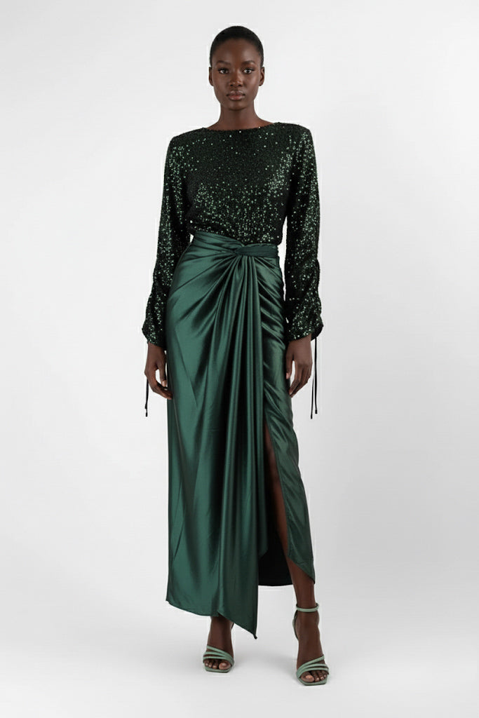 Regular price £500.00Unveil effortless glamour in our 'Giselle' green sequin dress with a satin wrap that effortlessly drapes and ties for a timeless silhouette. Luxurious, captivating, and ready to make a statement at your next occasion.